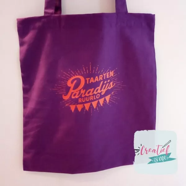 Voor TaartenParadijs Ruurlo mochten wij katoenen tassen bedrukken met hun bedrijfslogo. Annelies heeft gekozen voor een mooie opvallende paars katoenen tas met een knal oranje bedrukking.